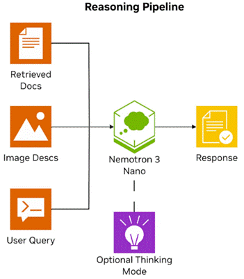 当检索到的文档包含图像时,智能体首先使用 Nemotron Nano VL 来描述这些图像,然后将所有信息传递给 Nemotron 3 Nano 以获得最终的响应。该模型支持可选的思考模式,可用于更复杂的推理任务: