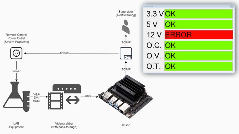 Automated supervision and warning system for lab equipment using Jetson and MQTT. This system monitors equipment from the '90s running on x86 computers. Because of the lack of software updates or modern OS support, the equpiment can't integrate into modern monitoring solutions or monitoring at all. Originally human operators or technicians monitored them 24/7 and waited for red led warning messages. Jetson addresses this in a cost-effective manner: attaching an HDMI Grabber with necessary adapters (for the equipment's VGA or DVI outputs, etc) and training a classification model to recognize "good" and "bad" states and alert supervisors or even turn off the power supply if something goes really wrong.